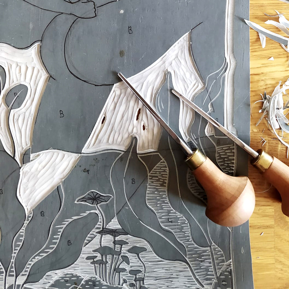 Each print is individually hand pressed from a hand-carved Lino block. This manual method enables texture to be incorporated into the design uniquely.