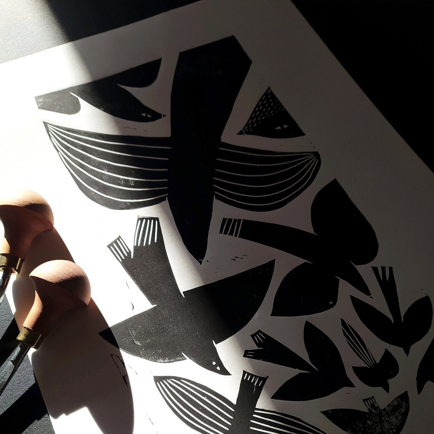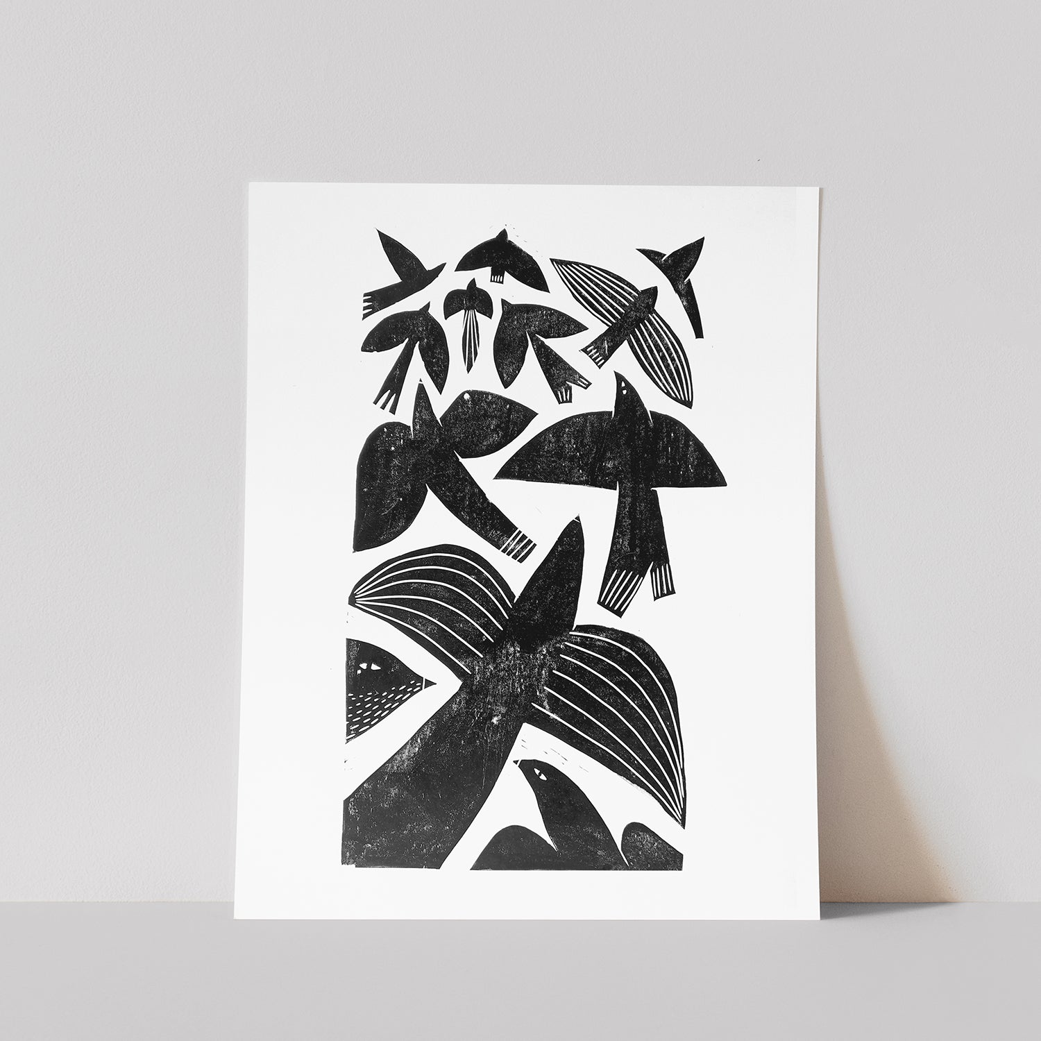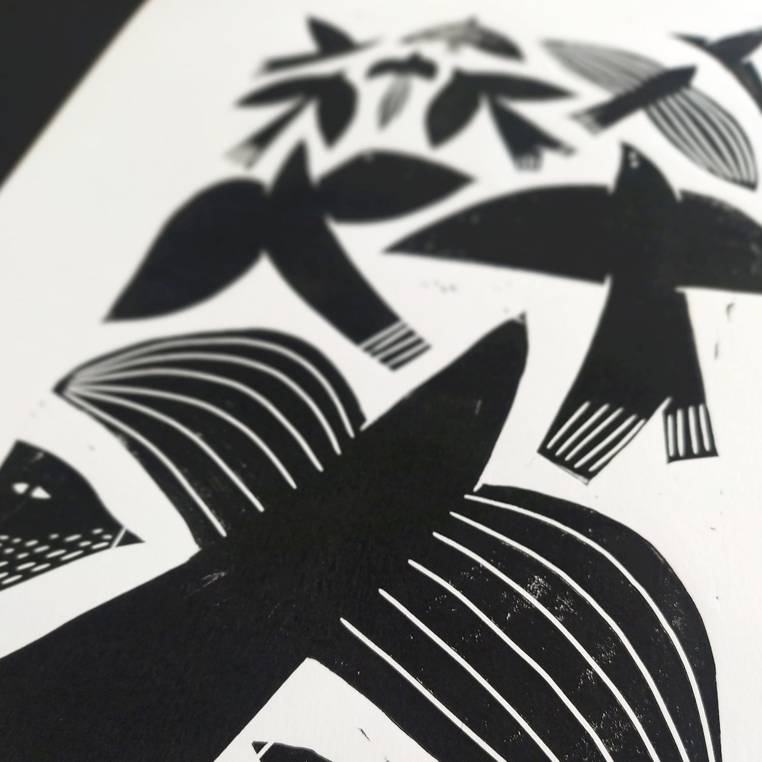 This print of birds in flight explores shapes and the how they interact with each other and is devoted to the admiration of the freedom there is in flight. Each print is individually hand pressed from a hand-carved Lino block. This manual method enables texture to be incorporated into the design in a unique way.